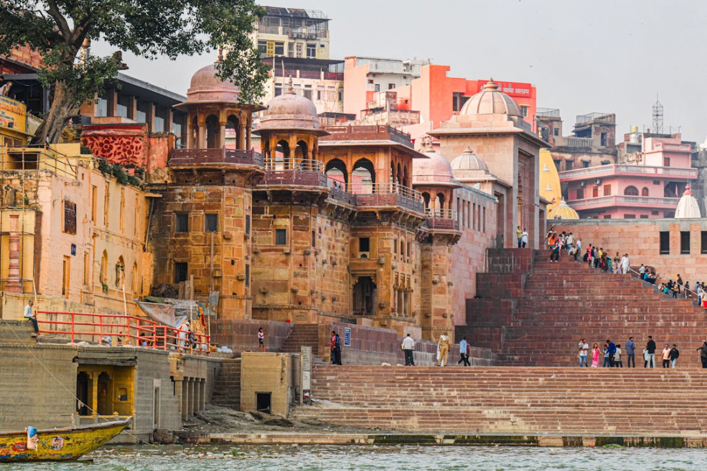 Caminar por sus ghats (escalinatas hacia el río) es presenciar el ciclo completo de la vida: oraciones, cantos, cremaciones, rituales y ofrendas se entrelazan en un flujo constante.